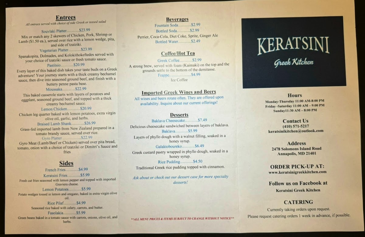 Welcome to Keratsini Greek Kitchen, located in Annapolis, MD, where authentic Greek flavors come to life. This delightful eatery offers a well-crafted menu that reflects the heartwarming essence of Greek home cooking. For starters, indulge in the Avgolemono Soup—a comforting blend of chicken, egg, and lemon broth, or the vibrant Side Greek Salad, brimming with fresh vegetables and feta.